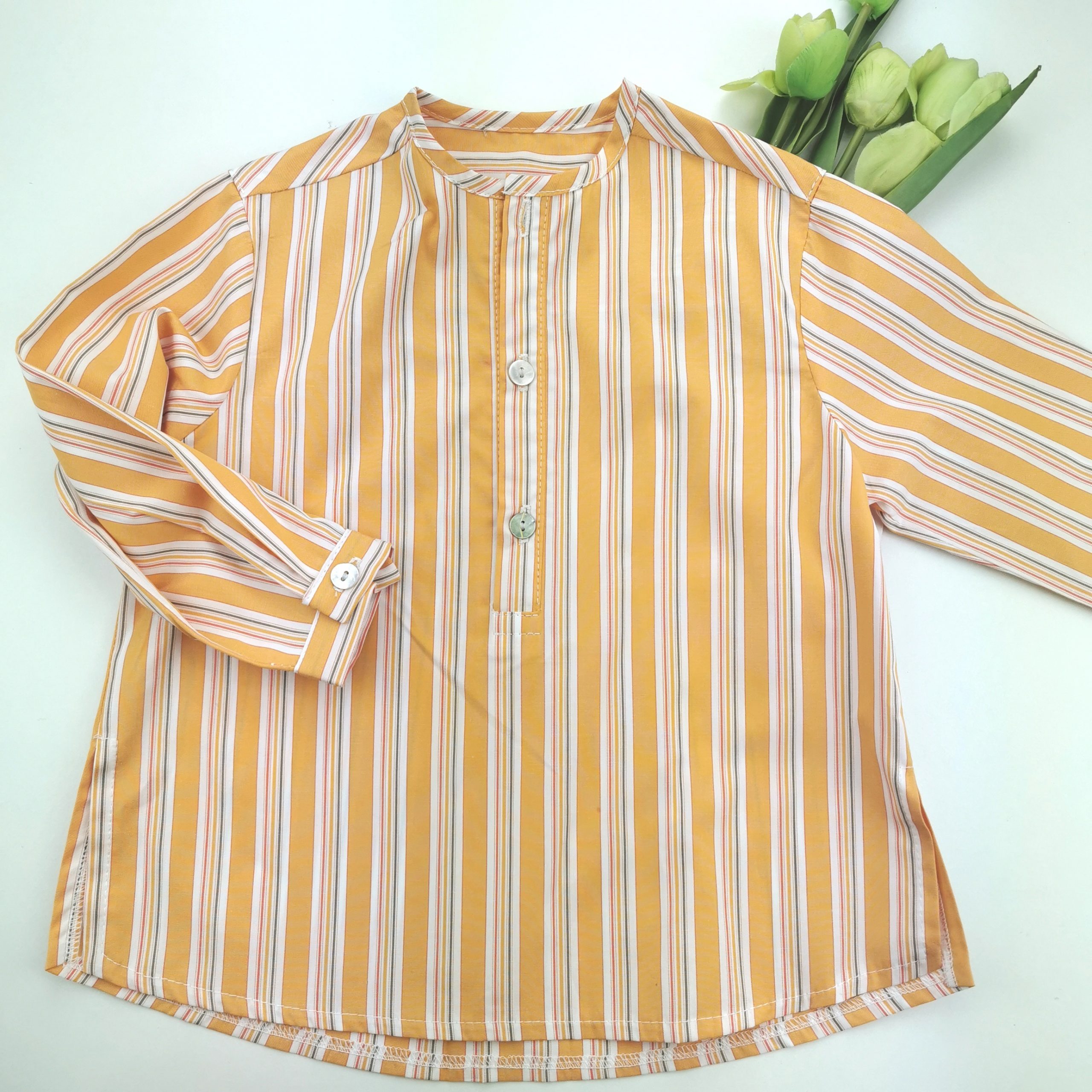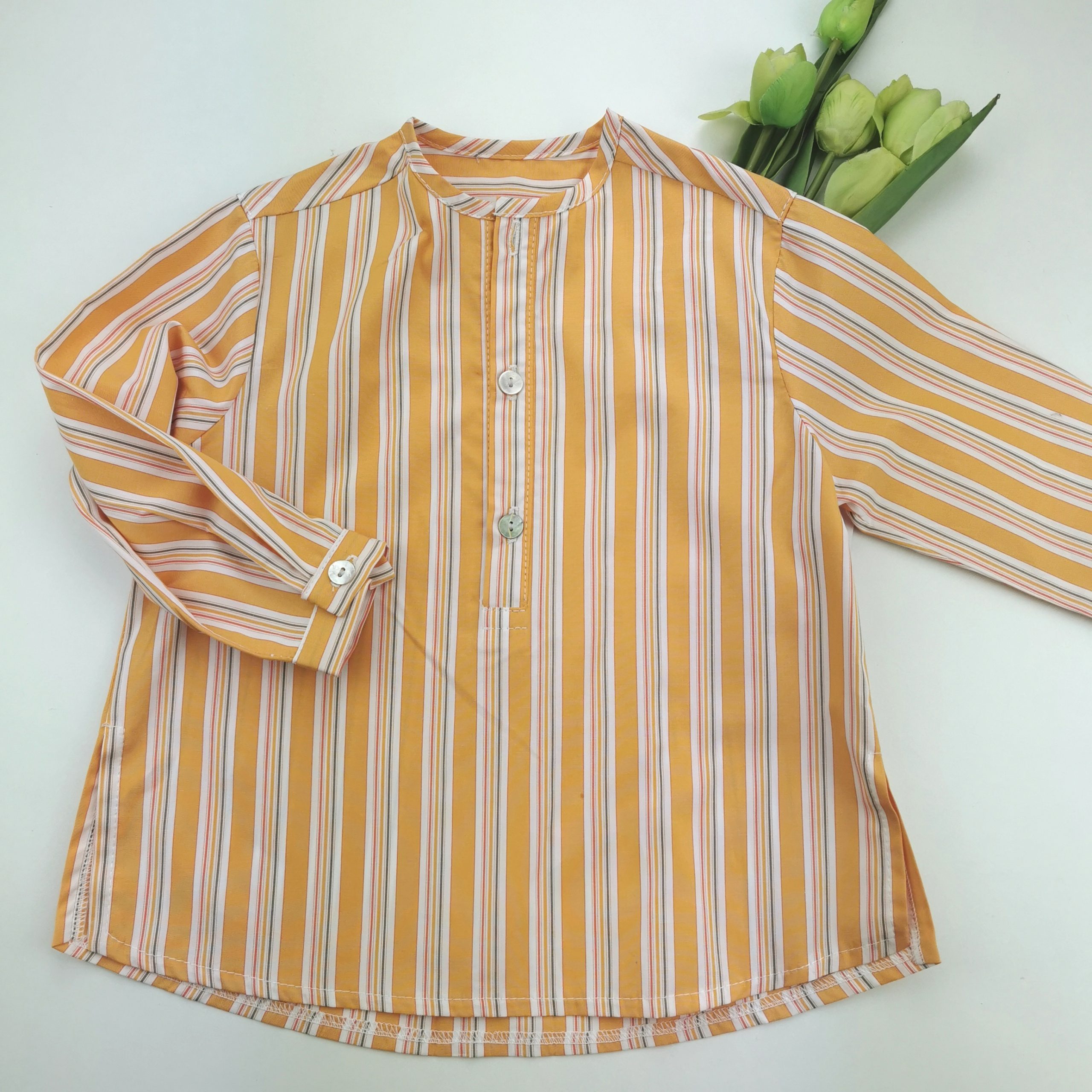 Camisa con puño en rayas naranjas y sin cuello combinala con la bermuda básica blanca